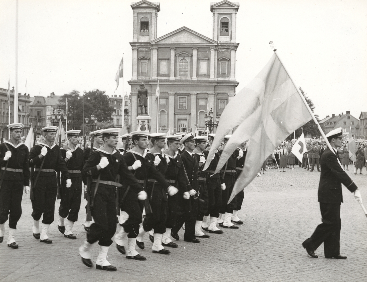 Flottans militärer under march på stortorget. Ett högre befäl tar täten med flaggan över axeln. I bakgrunden syns Fredrikskyrkan.