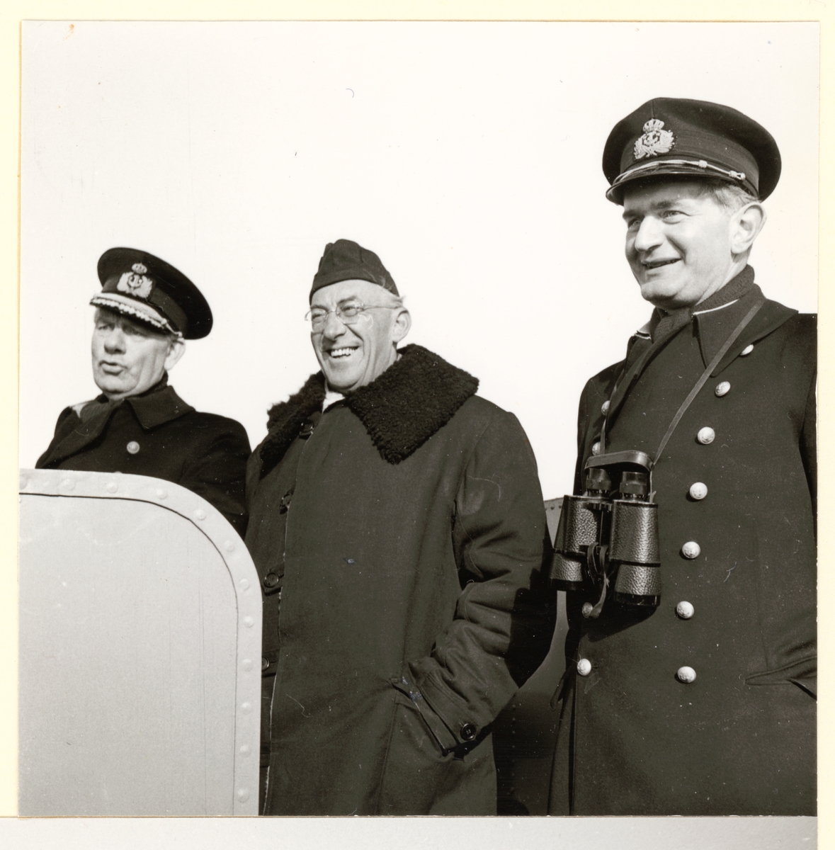 Titel: Bilden visar tre höga svenska sjöofficerare på bryggan av kryssaren Göta Lejon.