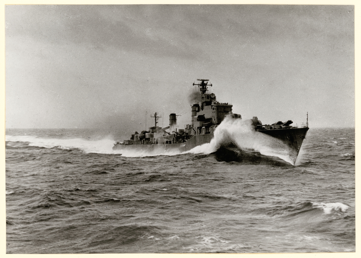 Titel: Bilden visar jagaren Halland i full fart till havs under en provtur.