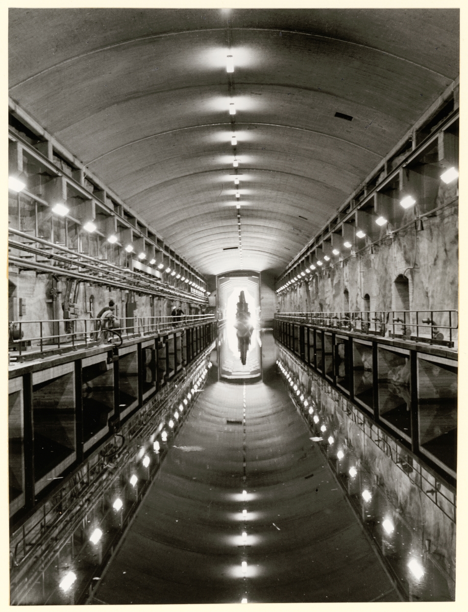 Titel: Bilden visar en tunnel för ubåtar. I bakgrunden syns en ubåt