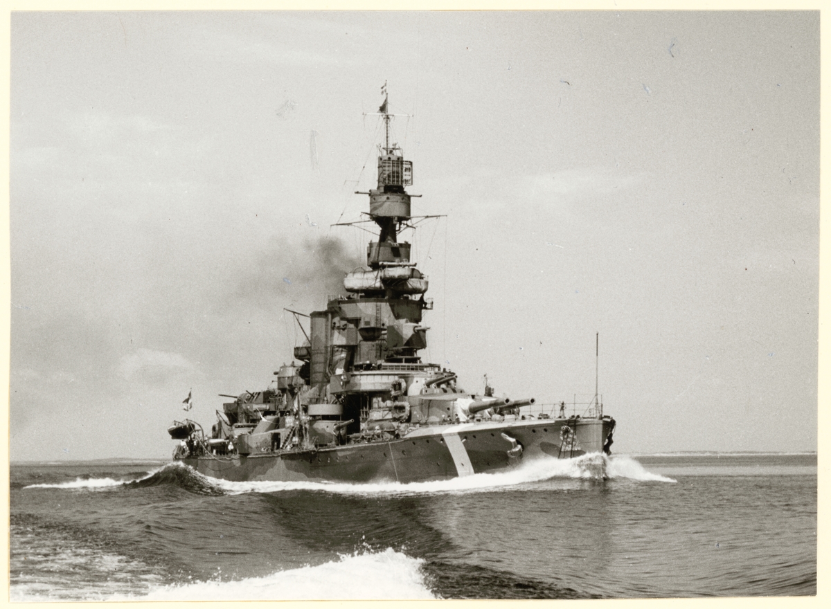 Titel: Bilden visar pansarskepp Sverige med neutralitetsmålning till sjöss.
