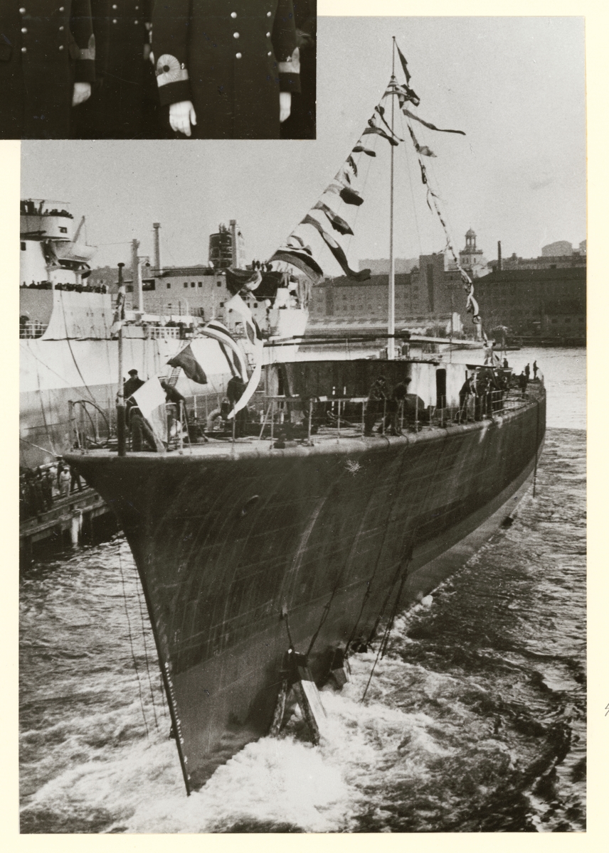 Titel: Bilden visar skrovet av jagaren Hälsingland som glider ner i vattnet under sjösättningsceremonien.