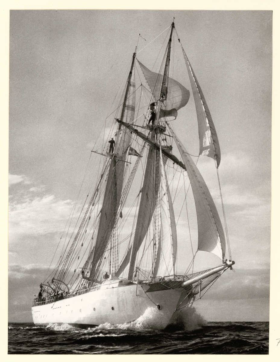 Titel: Bilden visar skolfartyget Falken under segel till havs.
