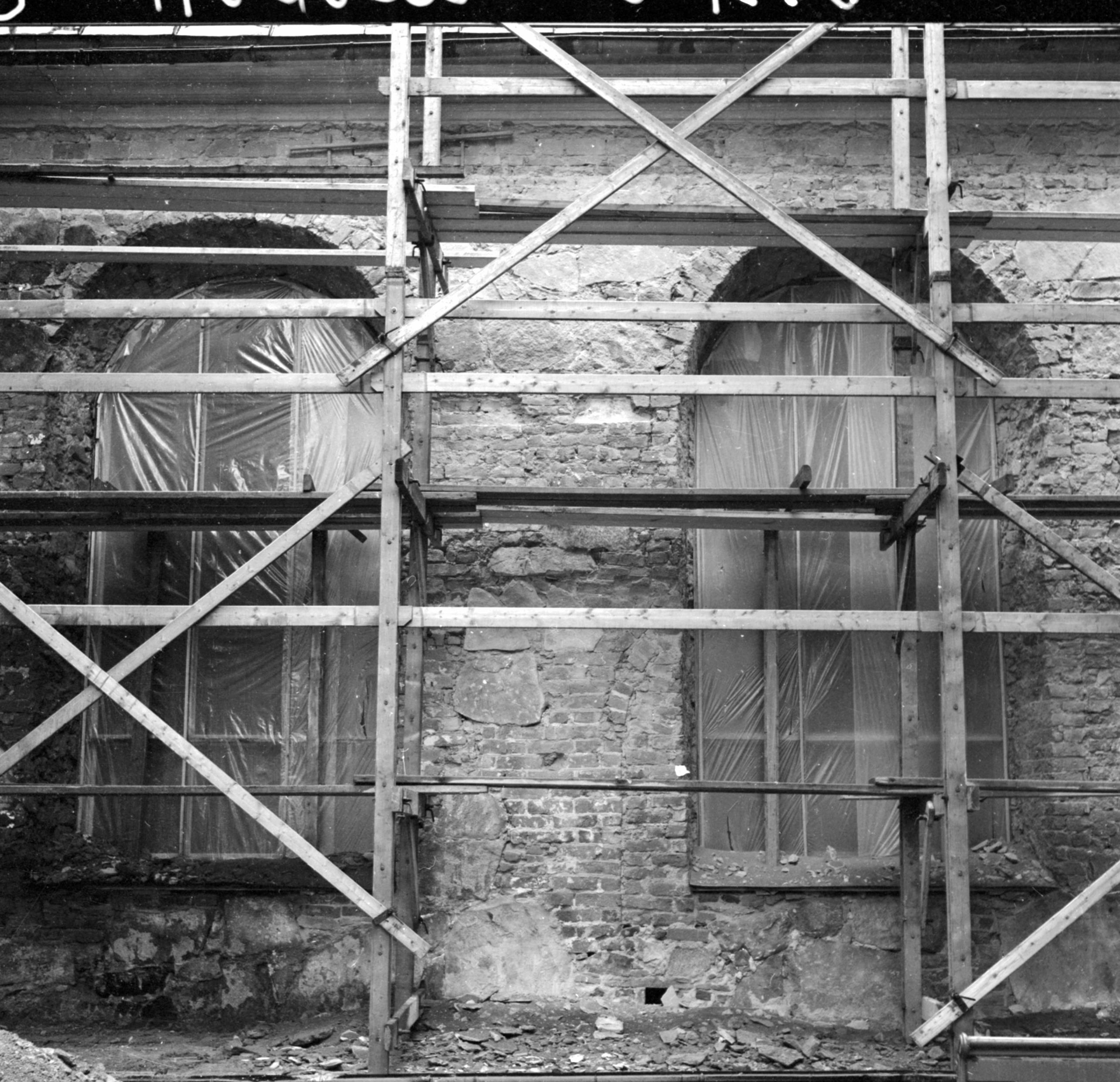 Långhusets sydfasad fotograferad från väster mot öster. Byggnadshistorisk undersökning i samband med omputsning 1963. Foto nr. 28.