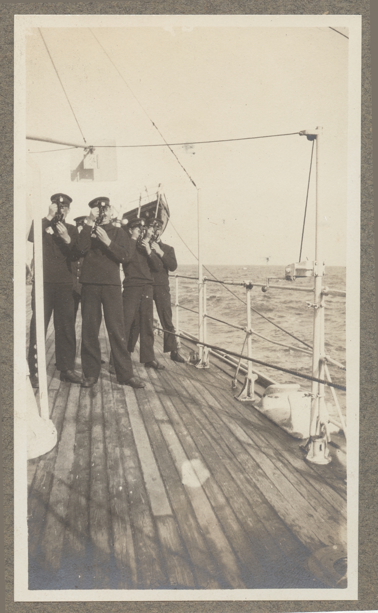 Titel: En grupp elever träna navigation medels sextanter ombord på Fylgia.