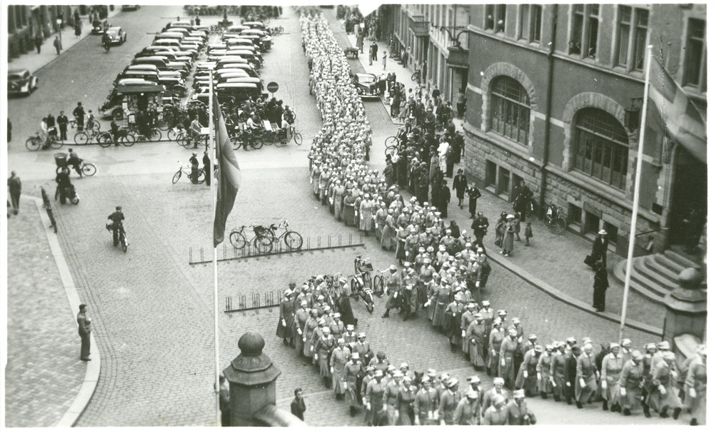 Vykort, föreställande parad i anslutning till Sveriges landstormskvinnors riksmöte i Helsingborg i juni 1939. Paraden går längs Stortorget och upp på Terasstrapporna.