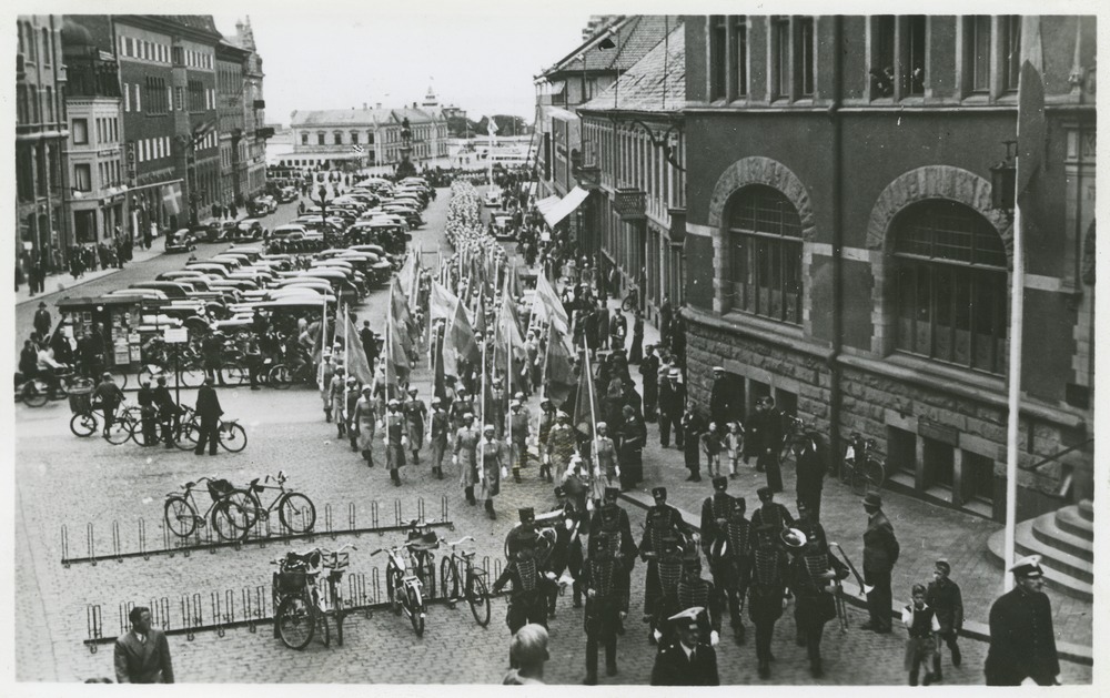 Vykort, föreställande parad i anslutning till Sveriges landstormskvinnors riksmöte i Helsingborg i juni 1939. Paraden går längs Stortorget.
