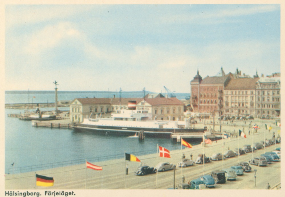 Vykort i färg förställande gamla färjeläget i Helsingborg