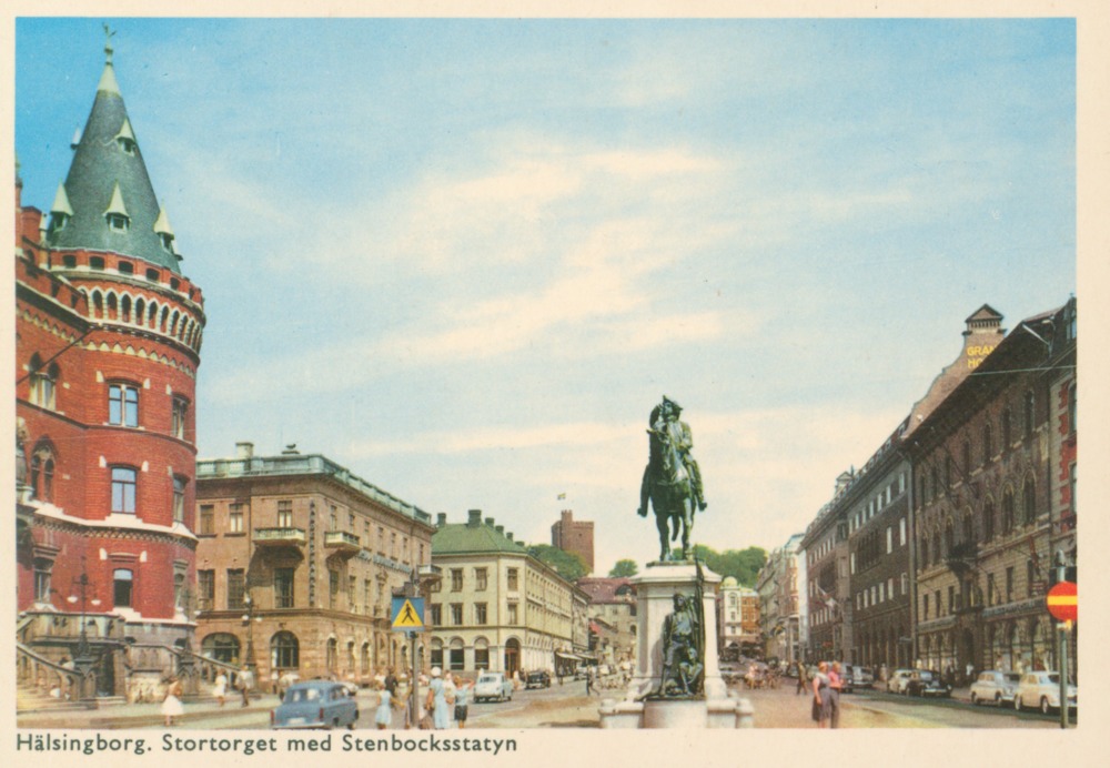 Vykort i färg förställande Stortorget med Rådhuset och stenbocksstatyn i Helsingborg