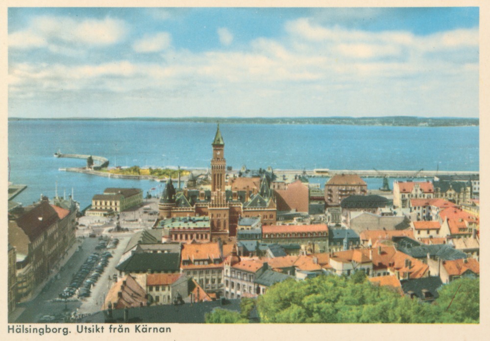 Vykort i färg förställande utsikt över Helsingborg från Kärnan