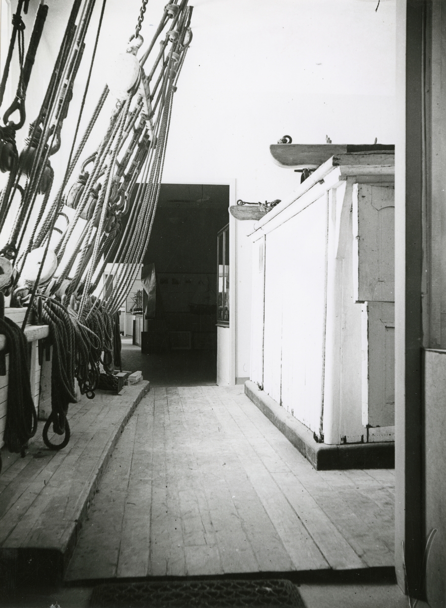 Samlingarna under uppordnade våren 1936. Utställningen i Sjöfartsavdelningen. HOPPETS skans.