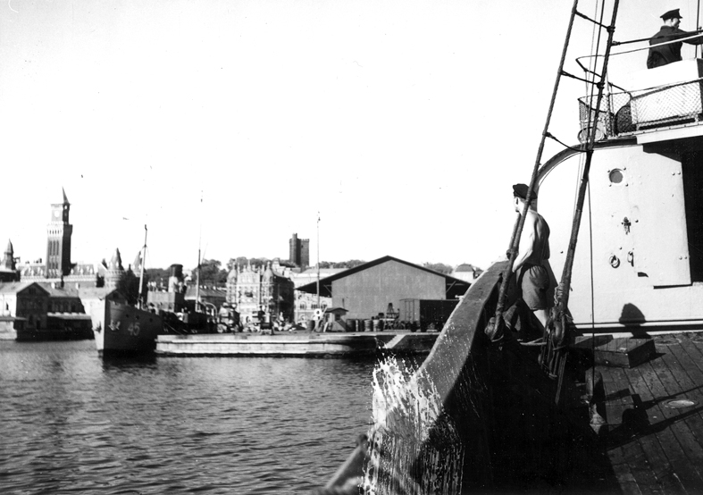 Hjälpvedettbåt 384. Fartyget löper in i Hälsingborgs hamn. Fil lic Gunnar Jonssons undersökningsresa till Västkusten juni 1940.