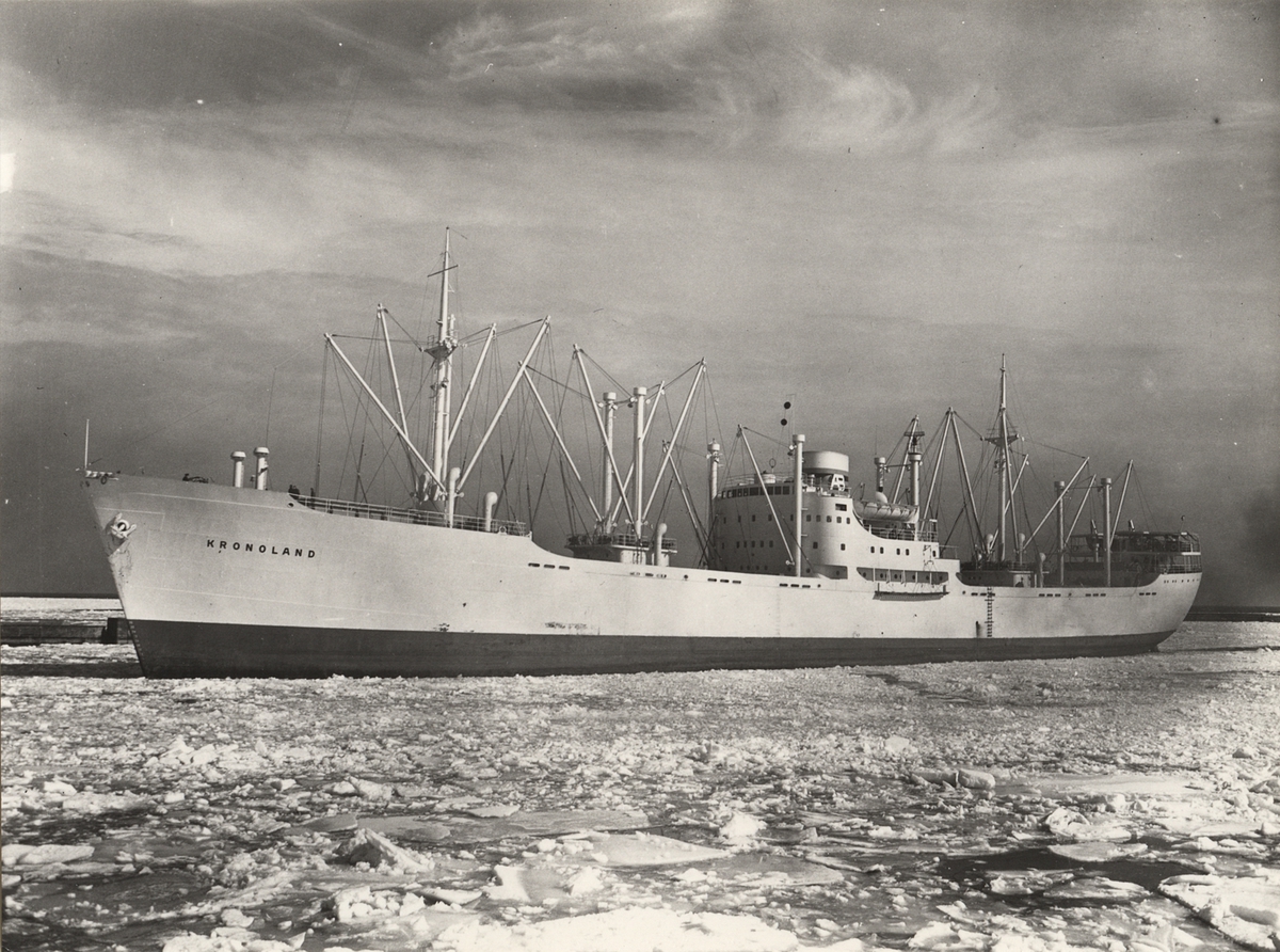 Foto i svartvitt visande lastmotorfartyget "KRONOLAND" i Köpenhamn någon av vintermånaderna under år 1954.