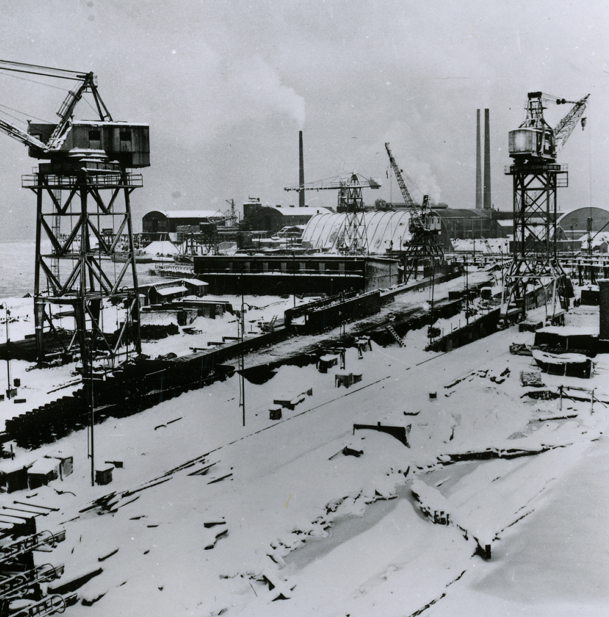 Oskarshamns varv. Motorfartyget MORVIKEN (Byggdes1936) på bädd den 23.12.1955 efter snöfall.