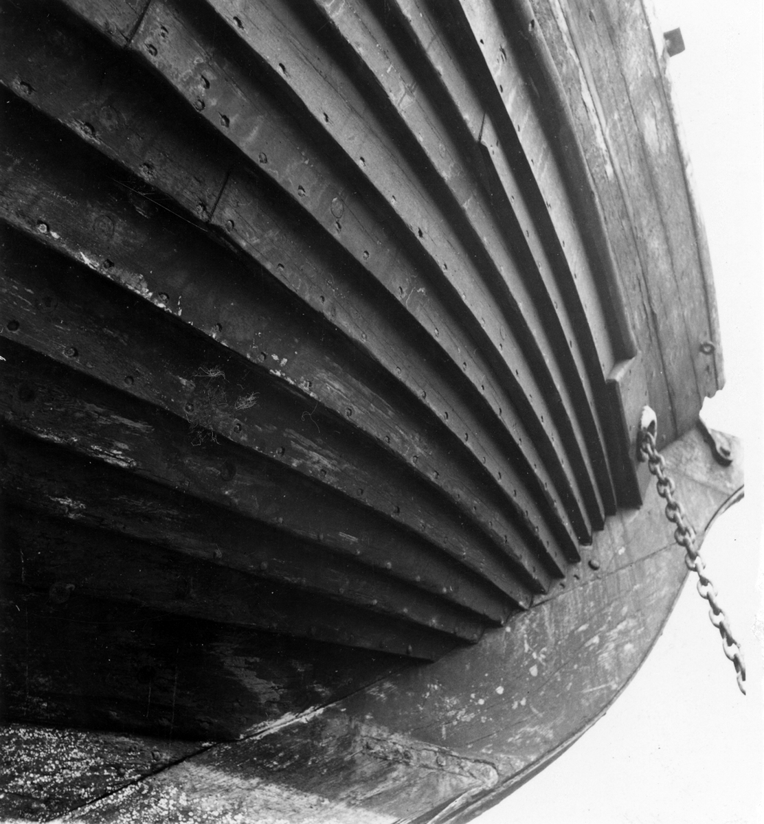 Uppland, Stockholms län, Frötuna skeppslag, Länna socken, Vettershaga. Vedjakten Adalia: Förskeppet snett underifrån. Foto i juni 1950.