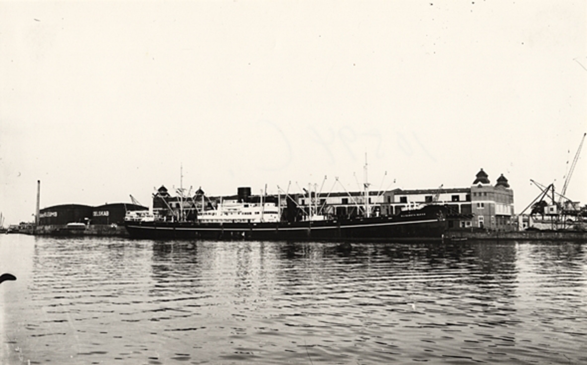 Foto i svartvitt visande lastmotorfartyget "ELISABETH BAKKE" av Haugesund vid kaj i Köpenhamn i slutet av 1930-talet.