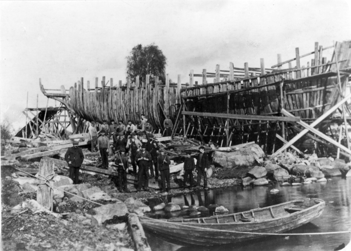 Fredriks Jonssons varv 1919. 3 msk Frejas spantresning. I förgrunden varvspersonalen. Längst t.v. varvsägaren och byggmästaren Fredrik Jonsson.