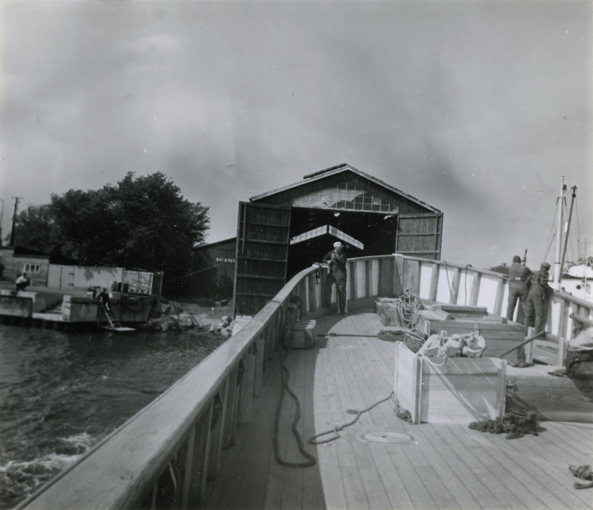 Medan flaggan slår ut för vinden passas ankartrossarna, som löper överbord.