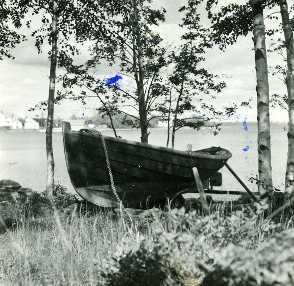 Sigvard Erikssons skötbåt, byggd omkring 1900. Sedd från styrbords bog och styrbords låring.