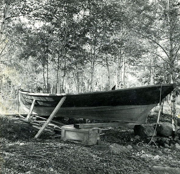 Sigvard Erikssons skötbåt, byggd omkring 1900. Sedd från styrbords bog och styrbords låring.