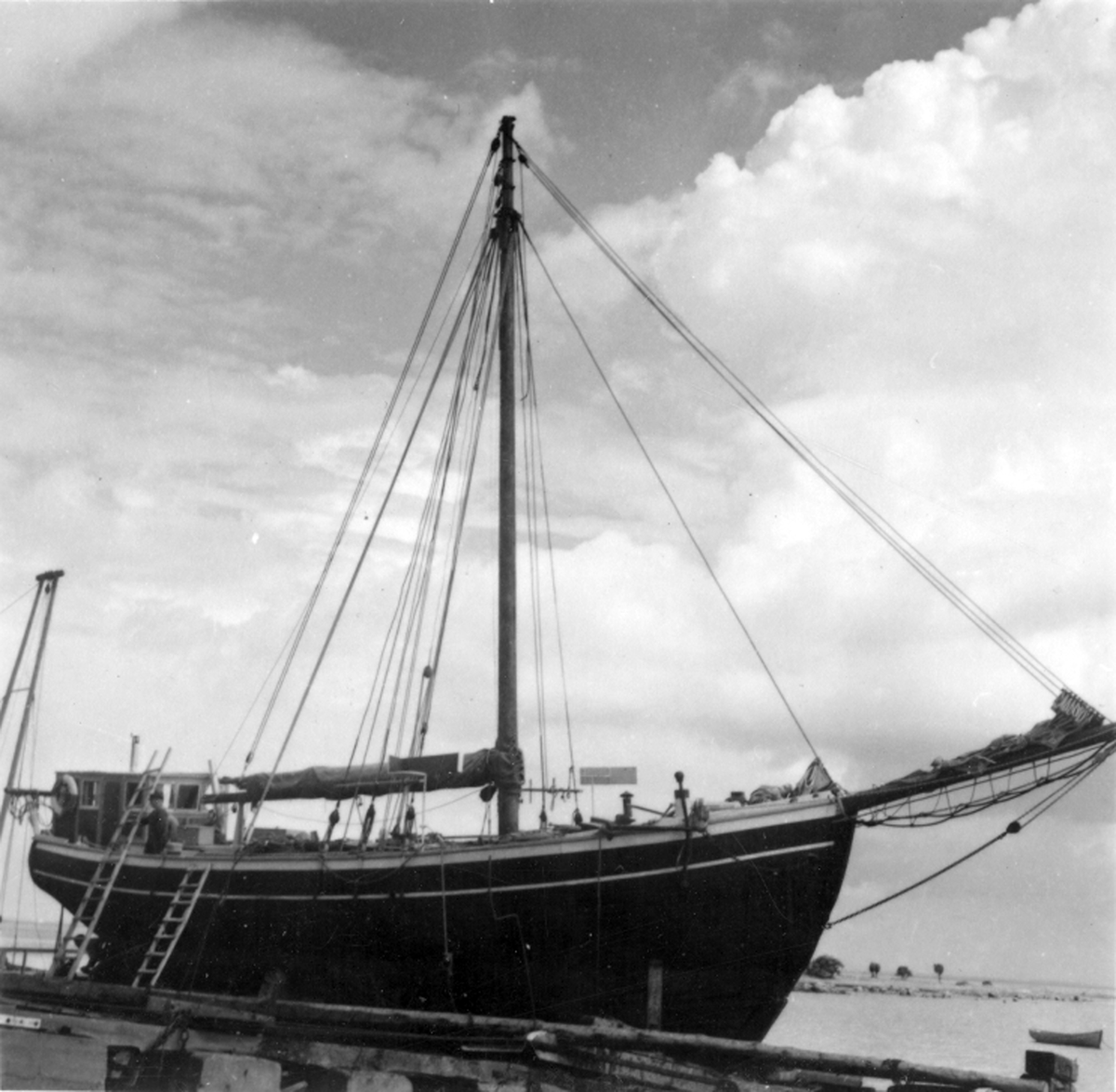 Fredrik Johanssons varv. Jakten Vega av Degerhamn, byggd i Bergkvara 1909. På slipen. Sedd förifrån och från stryrbord.