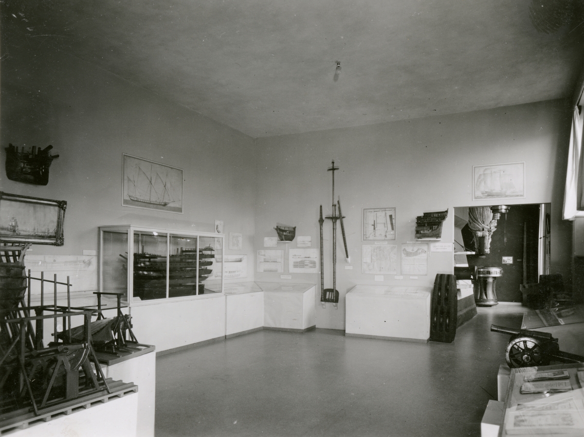 Tillfällig utställning, "Chapmanutställningen" i Chapmansalen, sal 6. Västra och norra väggen. Fartygsmodeller, konst, ritningar m.m.