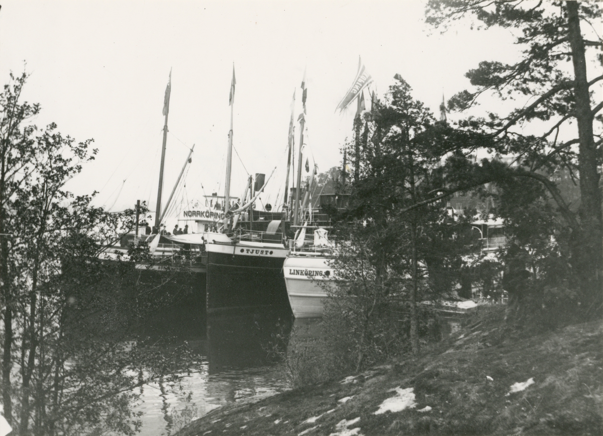 Ångfartygen Linköping, Tjust, Södern och Norrköping vid Johannelunds brygga.