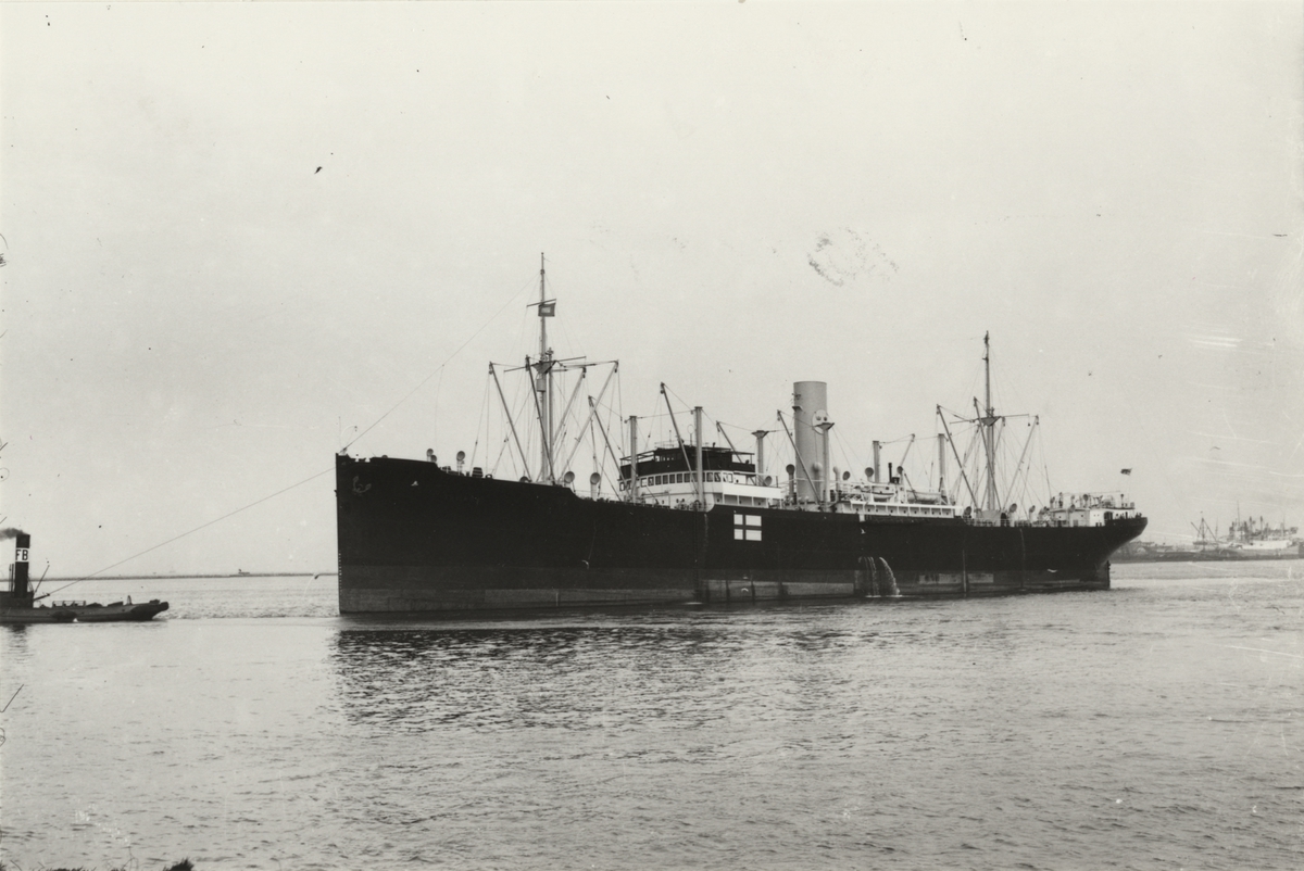 Foto i svartvitt visande lastmotorfartyget "TAMARA" av Göteborg under bogsering i Köpenhamn under år 1940.