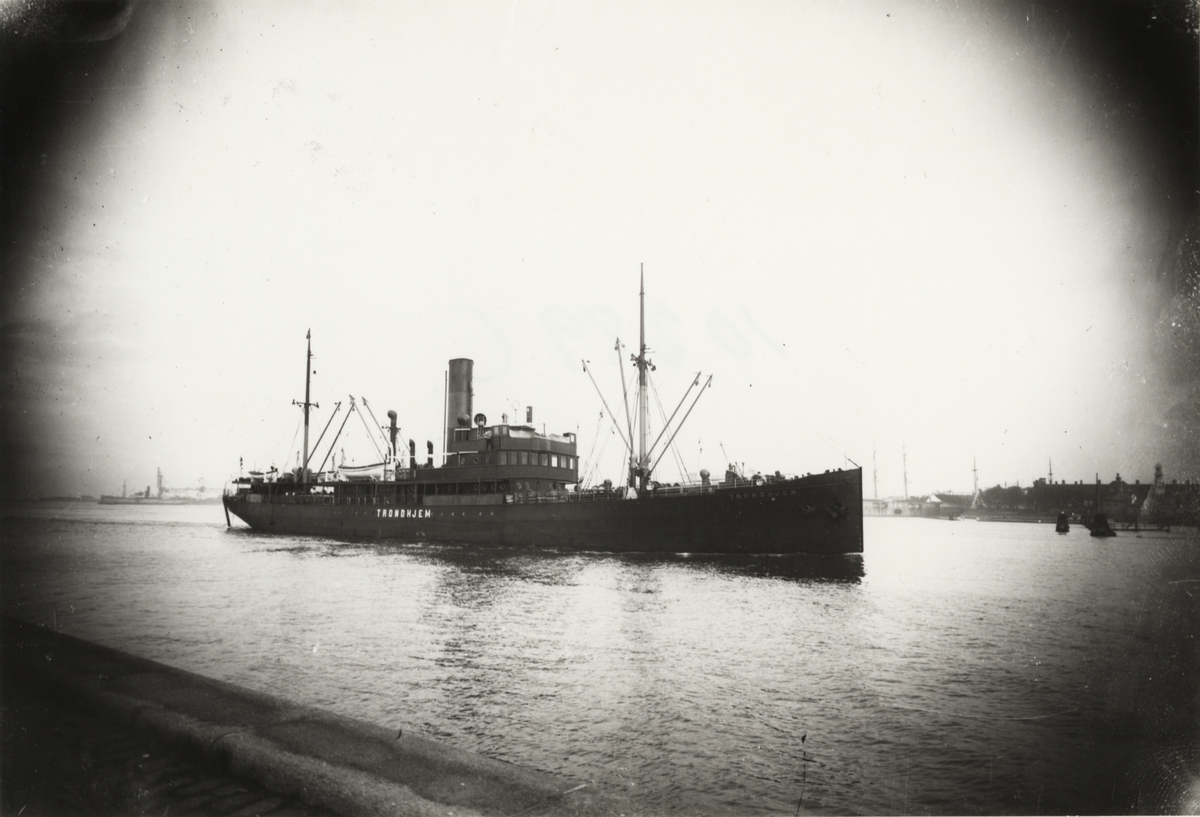 Foto i svartvitt visande last- & passagerarångfartyget "TRONDHJEM" av Köpenhamn i Köpenhamn under 1930-talet.