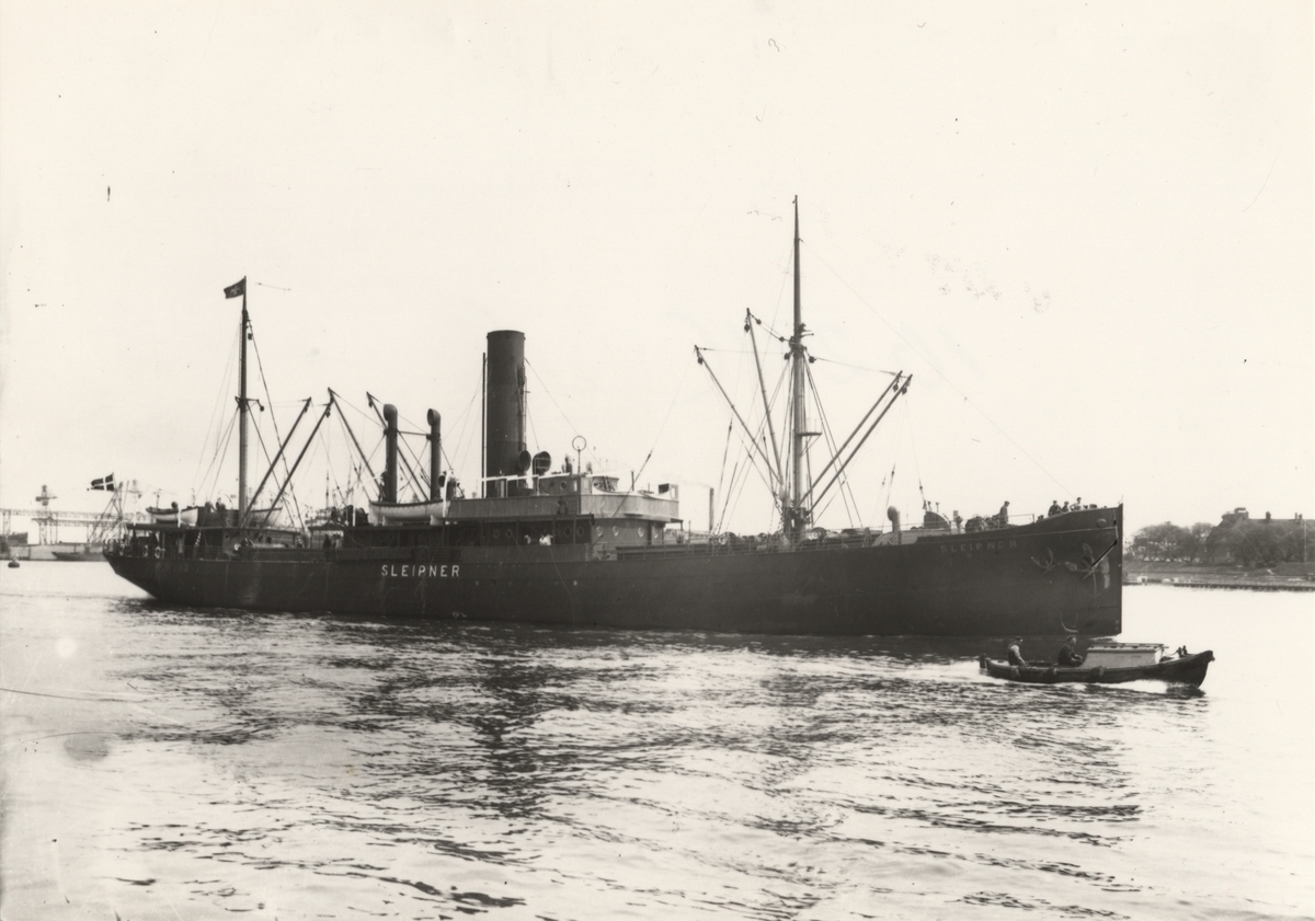 Foto i svartvitt visande lastångfartyget "SLEIPNER" av Köpenhamn i Köpenhamn under 1930-talet.