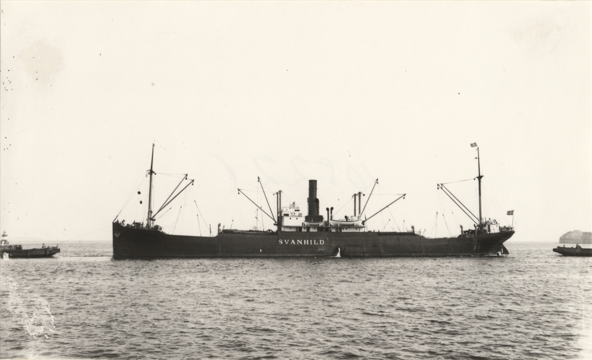 Foto i svartvitt visande lastångfartyget "SVANHILD" av Helsingör under bogsering i Köpenhamn på 1930-talet.