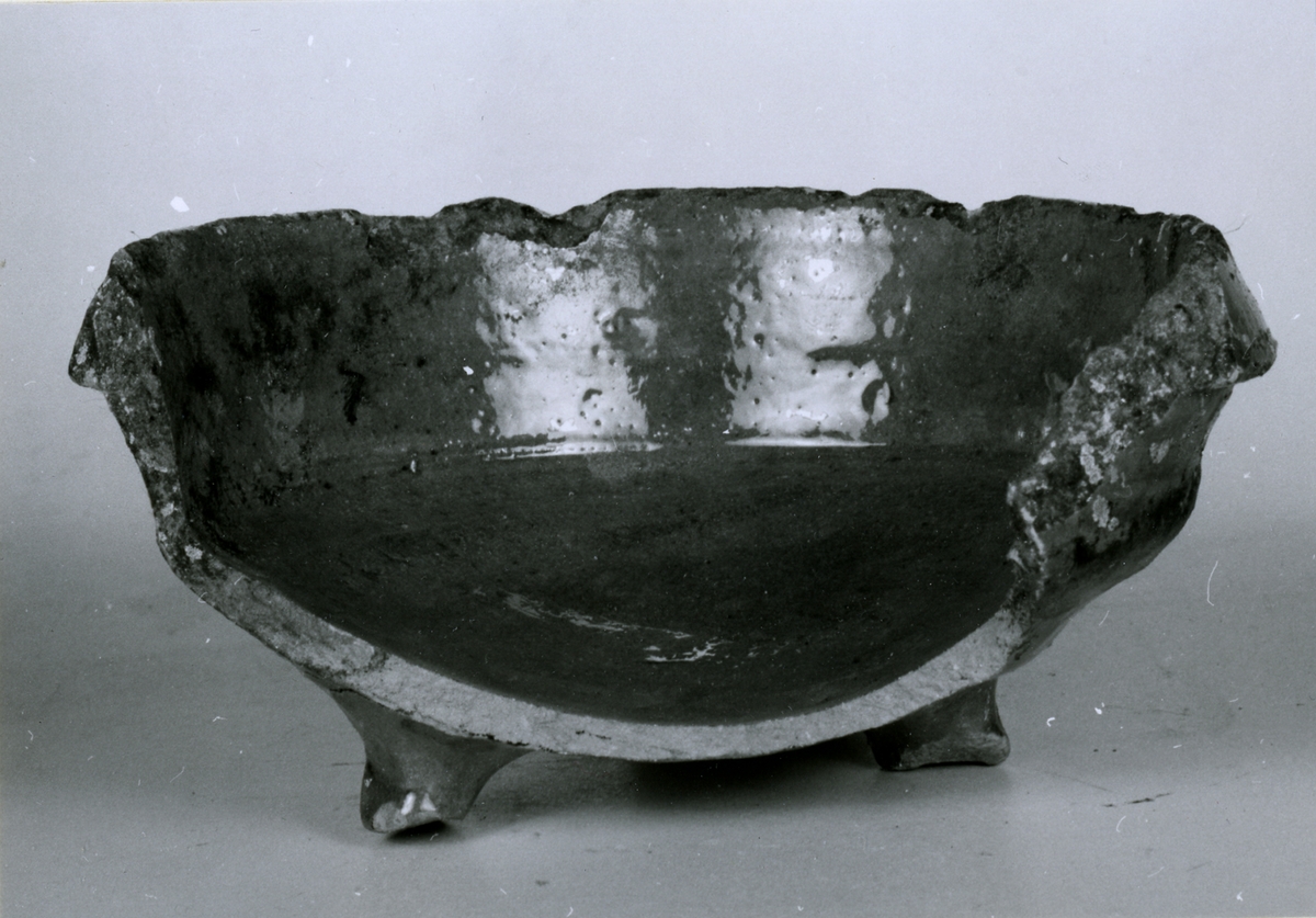Skål av rött lergods, på tre ben, helt glaserad, ca 40% avslaget. Sjöfynd från Djurhamn.