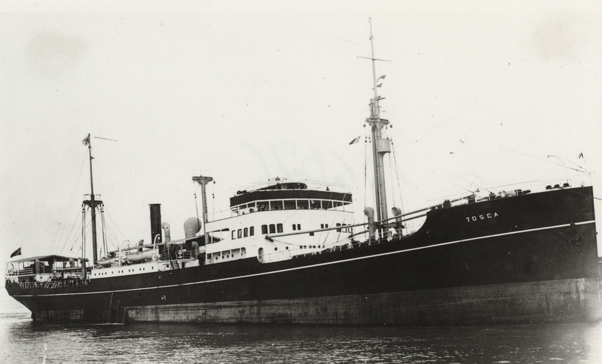 Foto i svartvitt visande lastmotorfartyget "TOSCA" av Haugesund i Köpenhamn under 1930-talet.