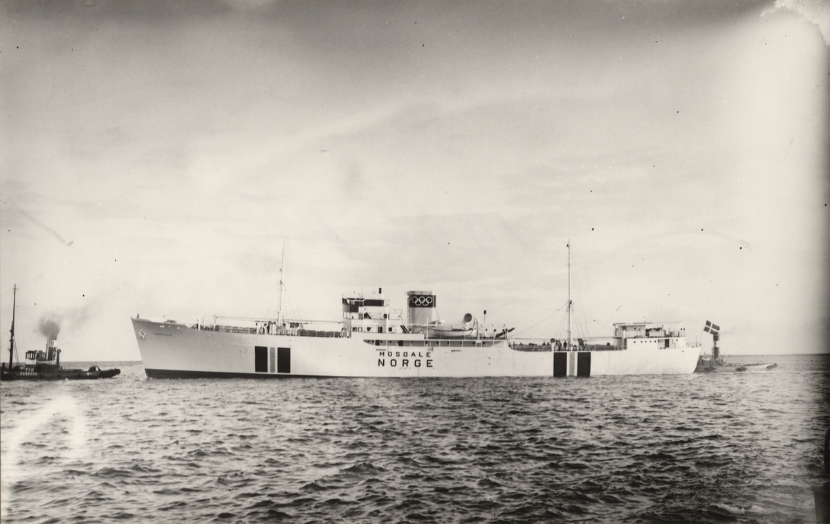 Foto i svartvitt visand elastmotorfartyget "MOSDALE" av Farsund i Köpenhamn, troligen i samband med provturen 1939.