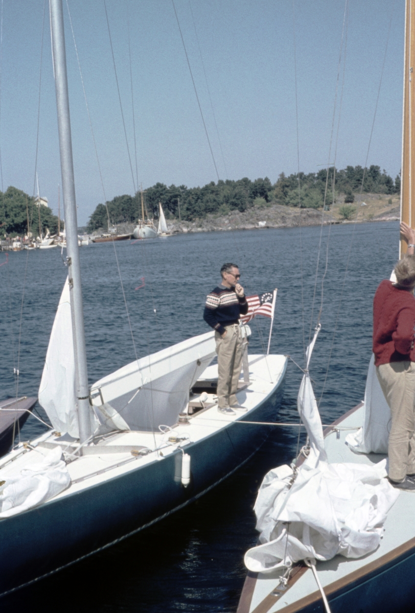 Ernest B Fay ombord på sin 5.5-metersjakt SABRE i samband med Sandhamnsregattan.