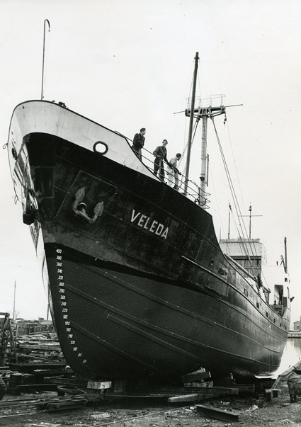 Holms skeppsvarv. S/S Veleda klar för sjösättning efter reparation 1956.