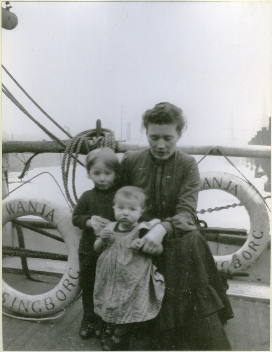 [från fotobeskrivningen:] [---] "Ombord på Wanja, Cuxhaven 1906, kapten Holmgrens hustru Hedvig med två äldsta barn." [---]