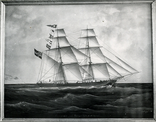 Fartygstavla hos fru Ruth Pålsson. Commandeur från Lerberget. Capt L.M. Pålsson. Akvarell signerad L.P. Sjöström 1871. Skåne, Malmöhus län, Viken.