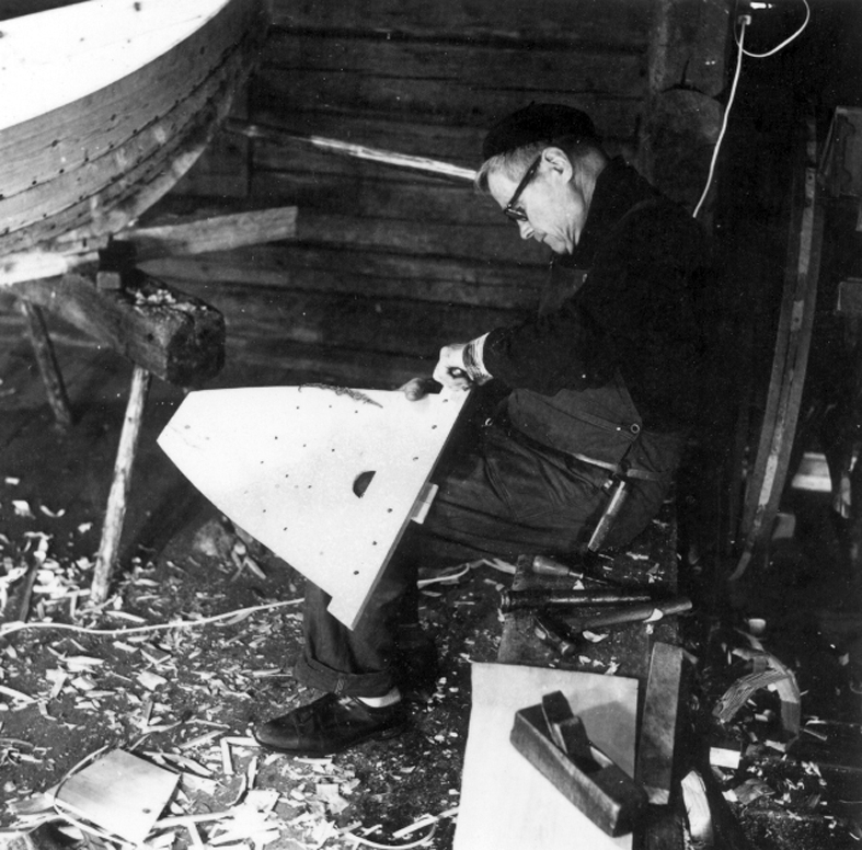 Neg nr 255, Baksotten under tillverkning. Den hålls ihop av en på översidan spikad tvärslå, fixeras på plats av en tapp i framkanten, sompassar i ett urtag i bakhusspantet, och kan lyftas ut med ett utsparat handtag. Foto 17.8 1962.