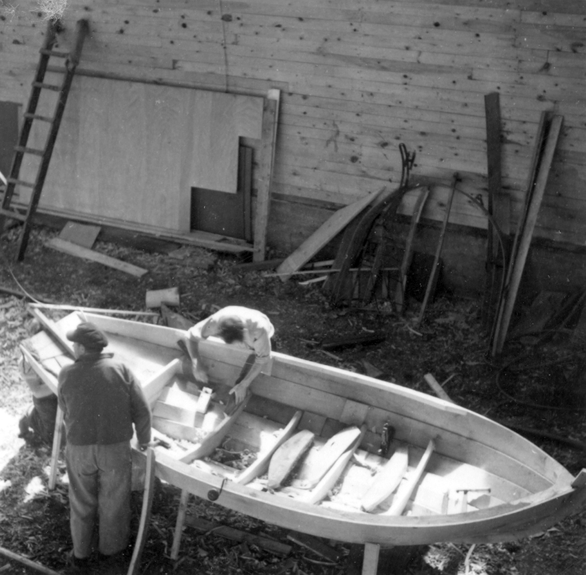 Hugo Olssons varv. Båtbyggare Inge Olsson lägger in intimren i en blekingseka.