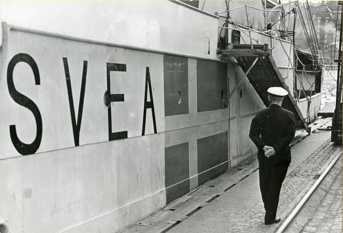 En vid Skeppsbron, Stockholm, liggande svensk ångare har försetts med tydligt skönjbart nationalitetsmärke.