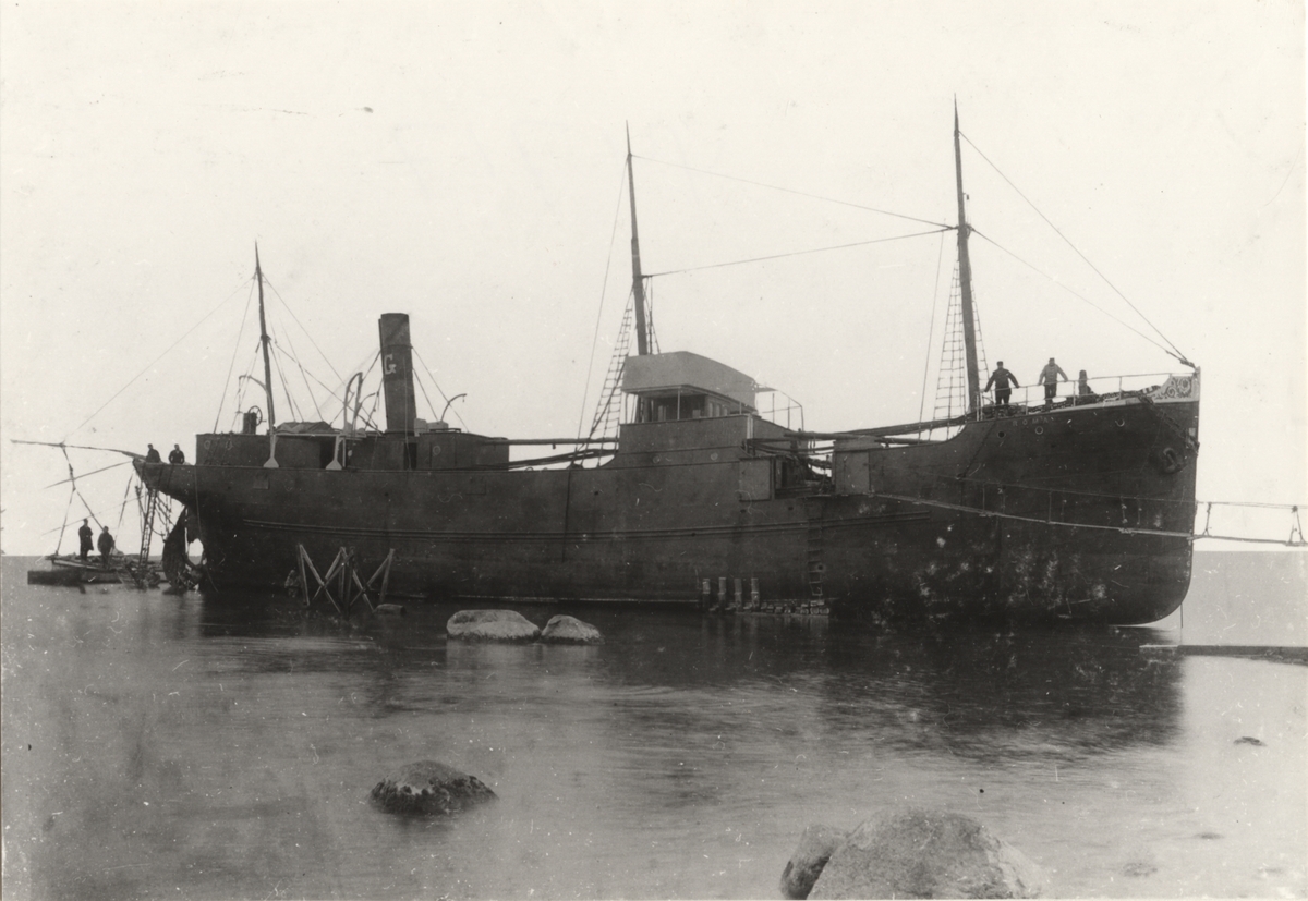 Titel: Foto visande lastångfartyget "ROMA" av Visby. På resa Stockholm - Burgsvik i barlast strandade fartyget 1900-09-26 vid Blåhäll, Tofta, Gotland på 2-3 fots vatten.