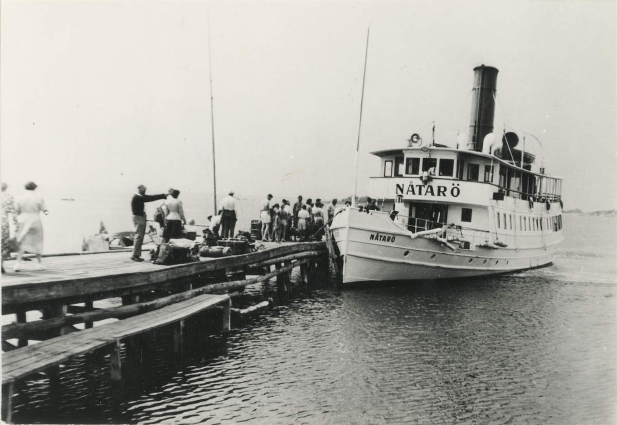 Foto i svartvitt visande passagerarångfartyget Nåtarö vid Nåtarö brygga, år 1955.