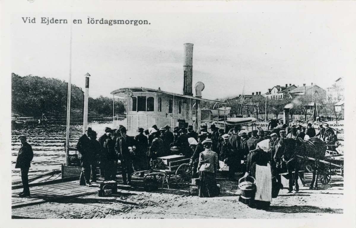 Vykort i svartvitt föreställande passagerarångfatyget EJDERN en lördagsmorgon vid kaj i Södertälje 1910.