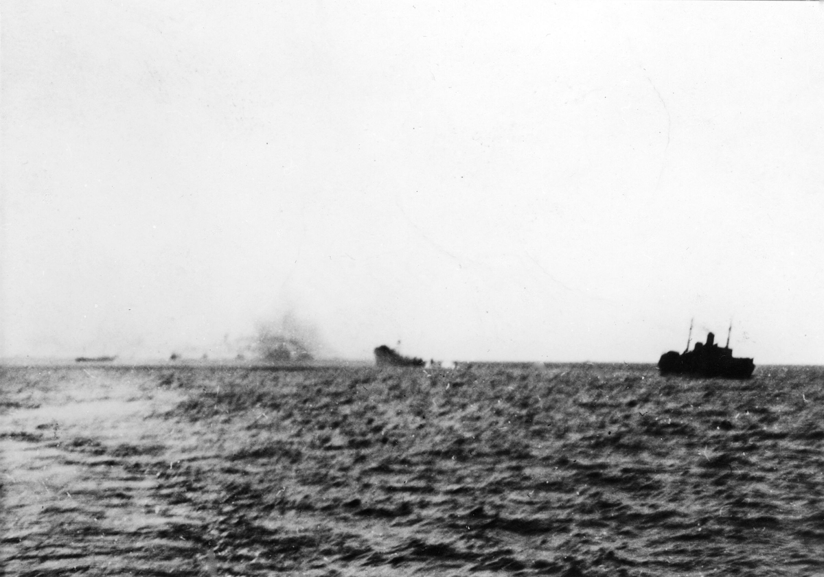 M/S Luleå i konvoj den 11 juli 1942 kl 1440-1505 före och efter dess torpedering utanför Idö, Västervik. Inlånat fotoalbum från Tage karlsson, fotograferat från S/S Polcirkeln.