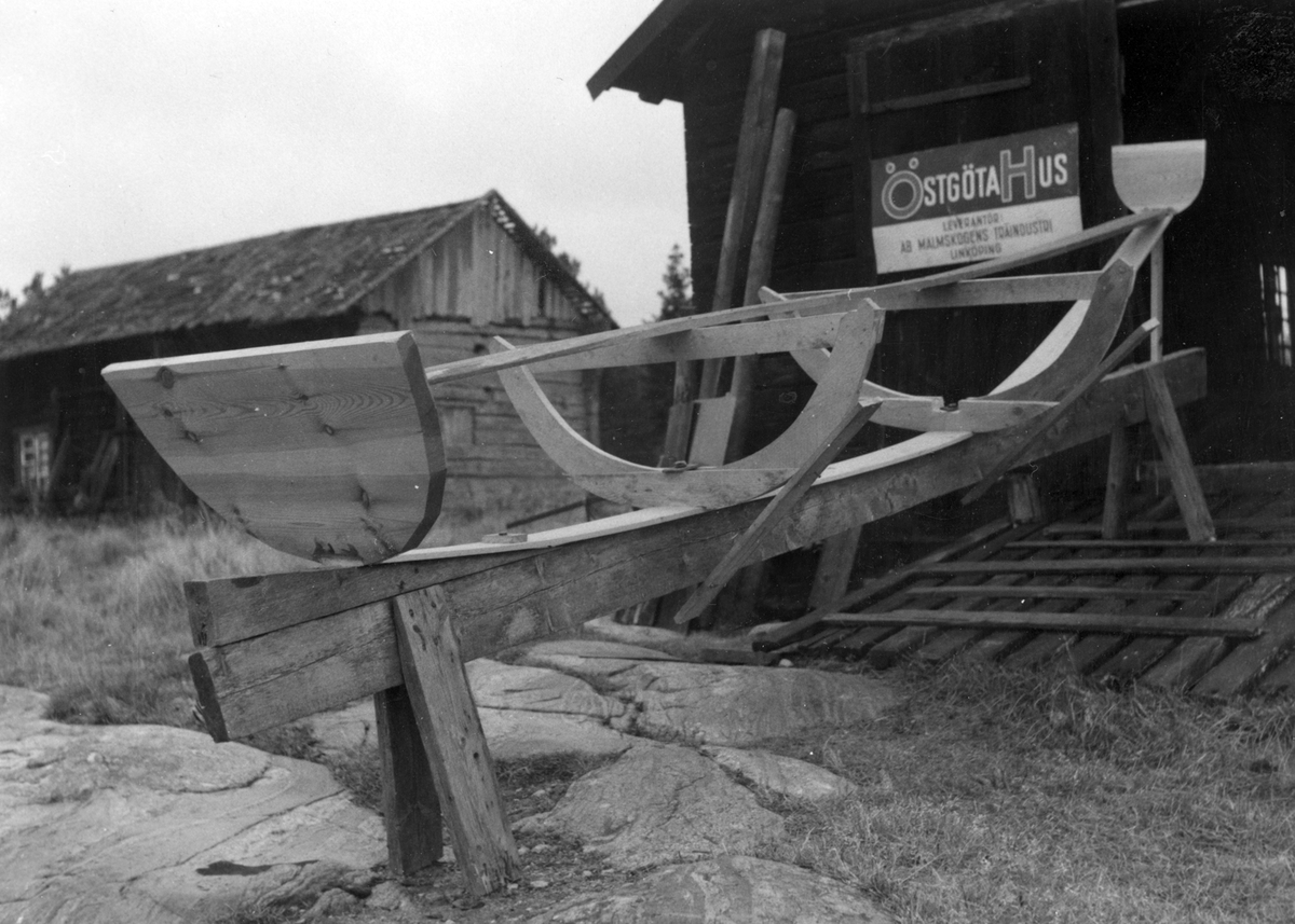 Båtbyggare Magnus Erikssons mallar till en ökstock. Foto i okt 1954.