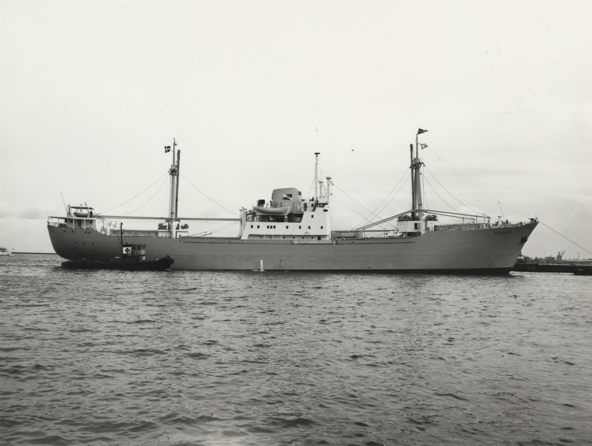 Foto i svartvitt visande lastmotorfartyget "TUMLAREN" i Köpenhamn under år 1958.