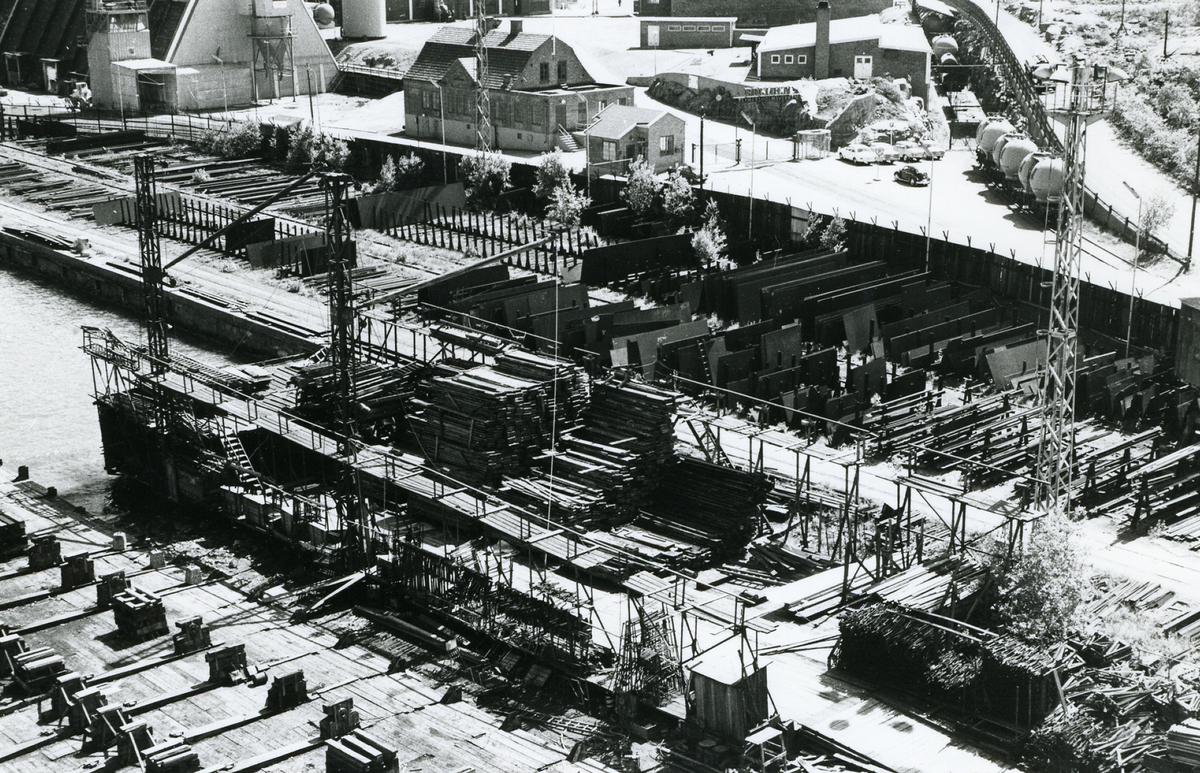Oskarshamns varv. Plåtförrådet vid slipen. I förgrunden lilla slipen. Lilla slipen upplag för byggnadsställningar.