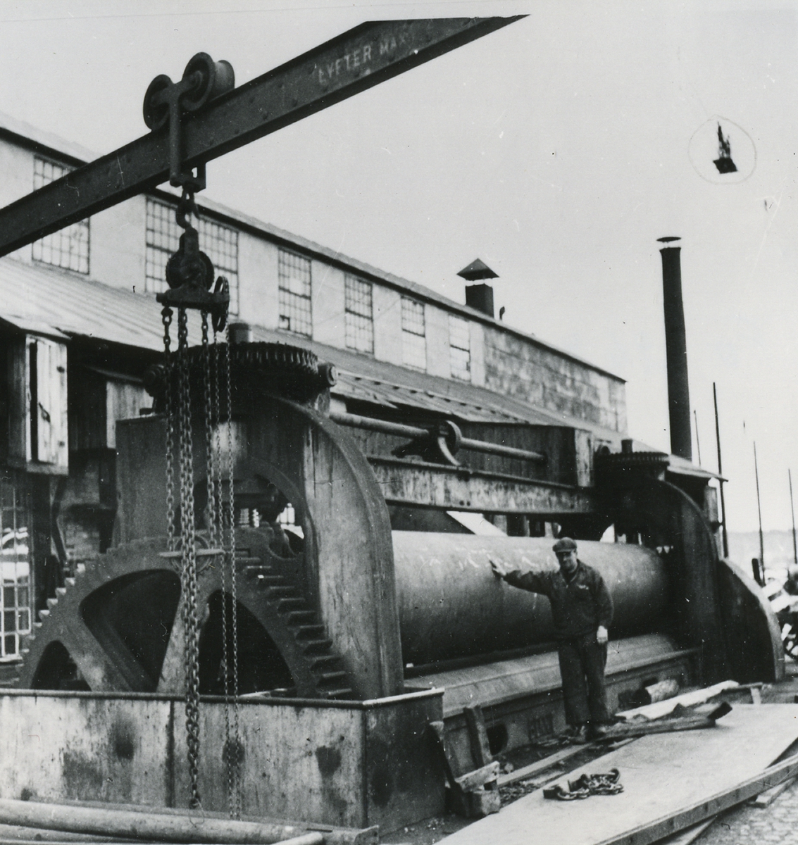 Oskarshamns varv. Stora skeppsbyggeripressen. Till höger står plåtslagarhantlangare Granlund.