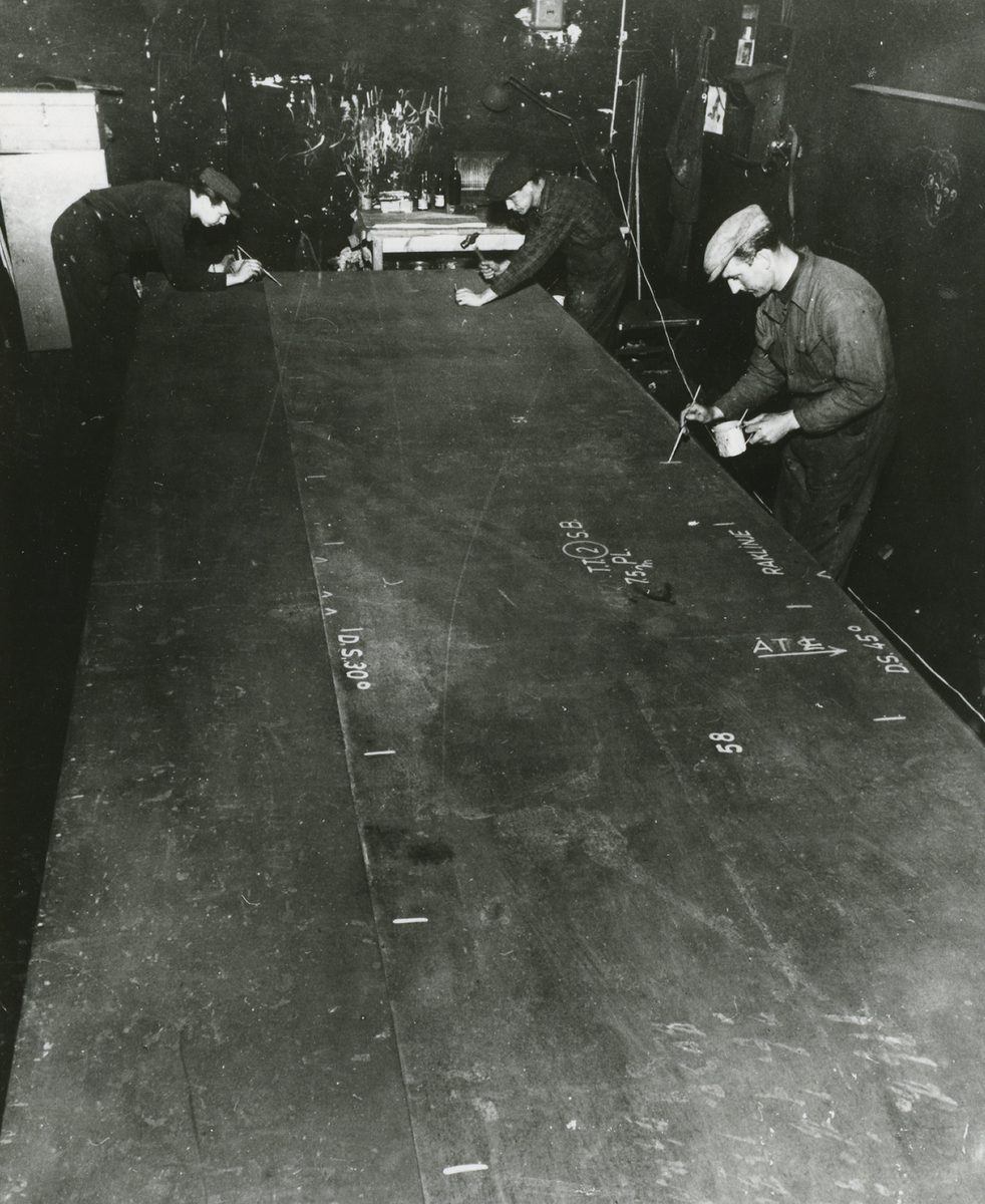 Oskarshamns varv. Ritningen överförs till fartygsplåten.